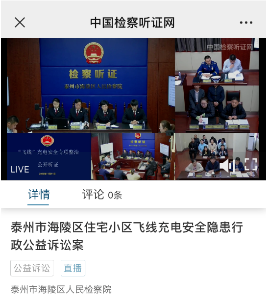 “飞线”充电属于公共消防安全领域,泰州市海陵区人民检察院为更好发挥检察机关公益诉讼职能,提升检察机关公益诉讼案件办理透明度和公信力,11月11日下午,泰州市海陵区人民检察院针对小区电动车飞线充电影响居民居住消防安全问题召开了听证会。