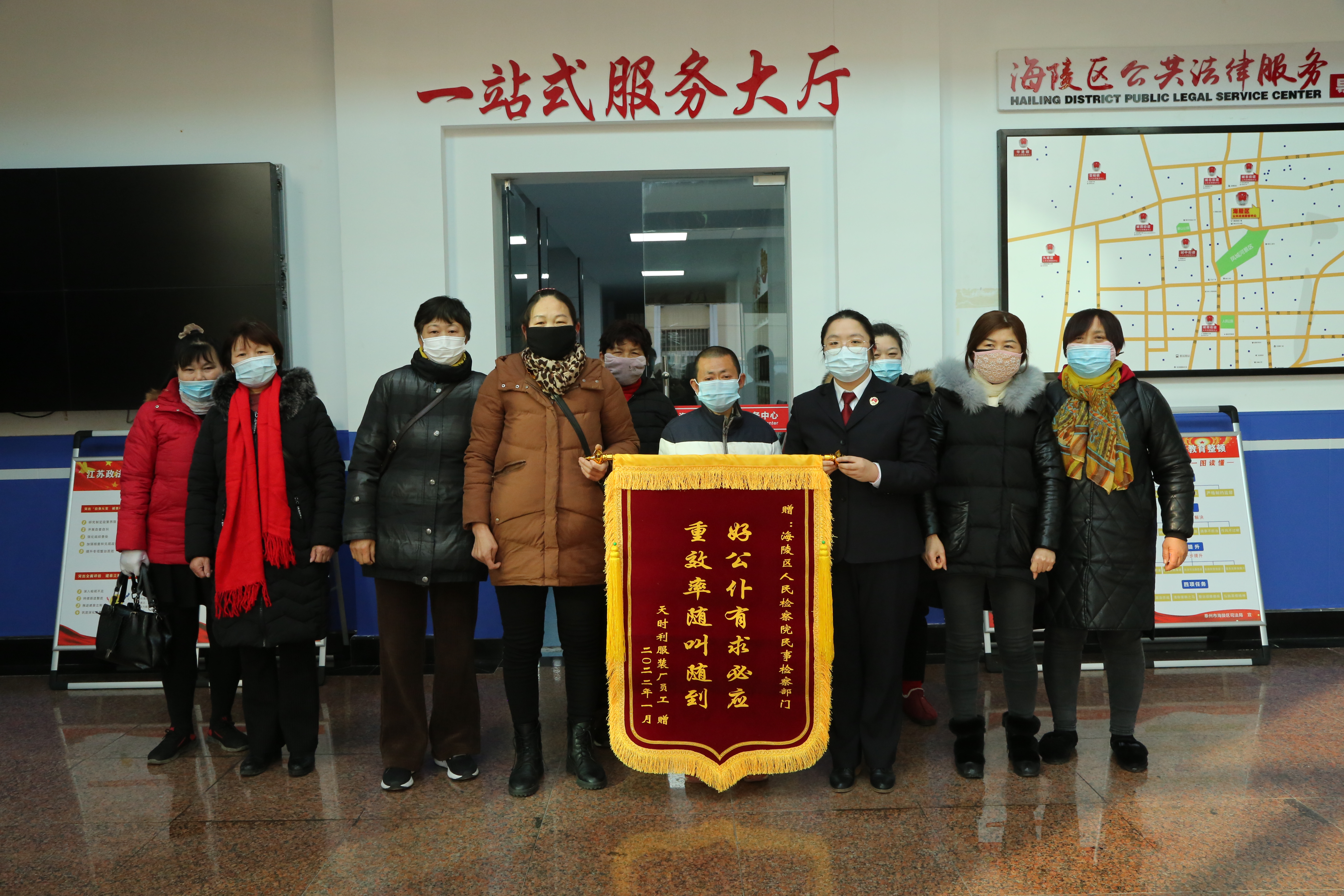近日,9名服装厂工人在时隔三年后终于拿到了被拖欠的工资,给海陵区检察院送来了“好公仆有求必应,重效率随叫随到”的锦旗。门外寒风凛冽,工人们被吹红的脸上却洋溢着温暖的笑容。
