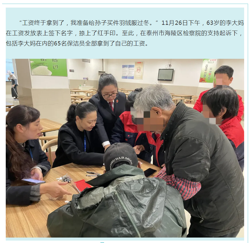 案件起诉后,保洁员们仍然顾虑重重,因被告单位在内蒙古,如果公司故意躲避诉讼,有可能会造成诉讼时间过长或法律文书无法执行。为及时消除顾虑、稳定人心,一方面泰州市海陵区检察院先后多次与泰州万达、内蒙古保洁公司的负责人分别沟通联系,明确在不影响万达集团与内蒙古某保洁公司制订的报酬支付计划的同时,务必要确保本地保洁员拖欠报酬在今年11月底之前足额支付到位;另一方面作为支持起诉人,海陵区检察院多次与该公司联系,释法说理,最终说服被告委托代理人及时参与诉讼。