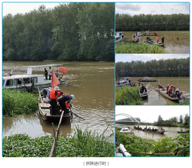 现场,共拆除5处巨大拦河罾,每处拦河“霸王罾”宽60余米,长80余米,共计拆除面积达24000多平方米。架构在河面及沿岸的扳罾、地笼网等非法渔网、暂养渔获的网箱和影响安全的绳索等设施全部清理拆除。