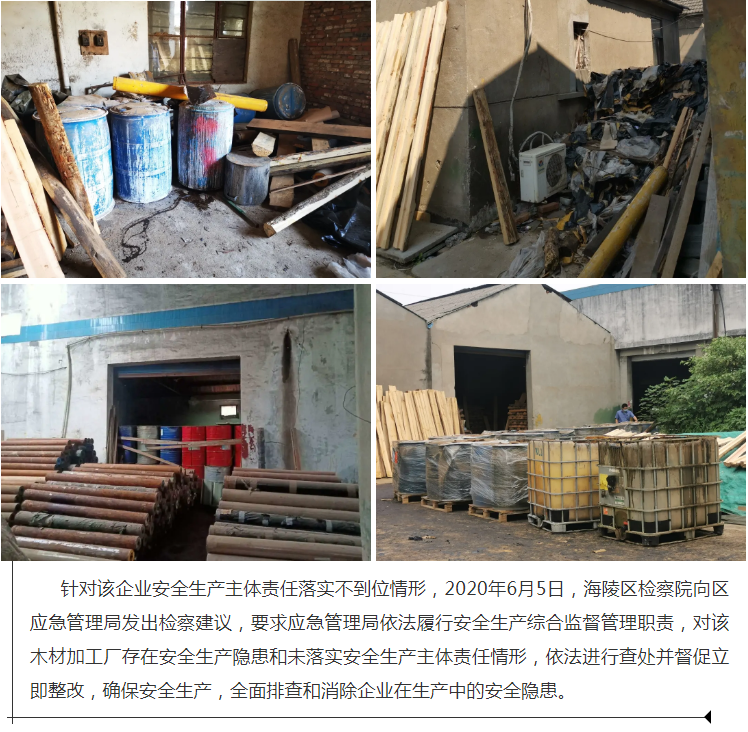 2020年5月,海陵区检察院公益诉讼部门干警在走访华港镇、摸排企业安全生产的过程中,发现华港镇李庄村一木材加工厂仓库内堆放了800桶化工废料,系华港镇村民周某某在没有处置资质的情况下,非法收购、长期存放在此地。