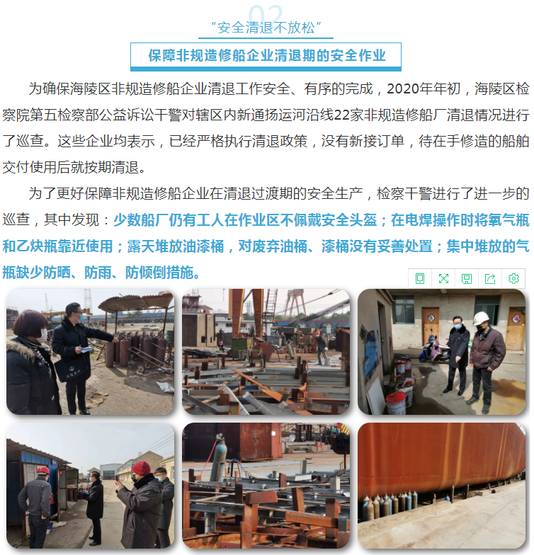 针对上述情况,海陵区检察院向企业安全负责人提出并要求及时加以整改,确保平稳过渡、安全清退。与此同时,向相关街道办事处发出工作提醒函,提醒街道对修造船企业开展安全生产专项检查,督促整改安全隐患,着力解决企业在生产经营过程中遇到的困难和问题,确保企业在规定期限内安全清退。