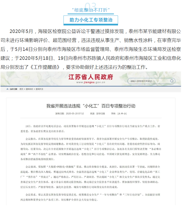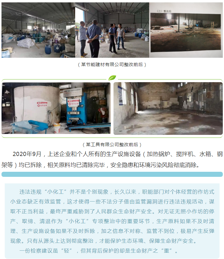 2020年8月,海陵区院从相关部门调取了“小化工”专项整治行动清单,对照清单,对苏陈镇、罡杨镇、九龙镇“小化工”企业的整治情况开展“回头看”。发现挂靠泰州市某工具有限公司的吴某某无证无照从事建筑胶水生产及销售,以及泰州市某节能建材有限公司均未能按照序时进度和“四个彻底”要求取缔和整治到位,属地政府未按照“小化工”专项整治行动要求督促两家公司彻底清理生产原料和产品、立即拆除生产设施设备,仍然存在较大的安全隐患和环境污染风险。