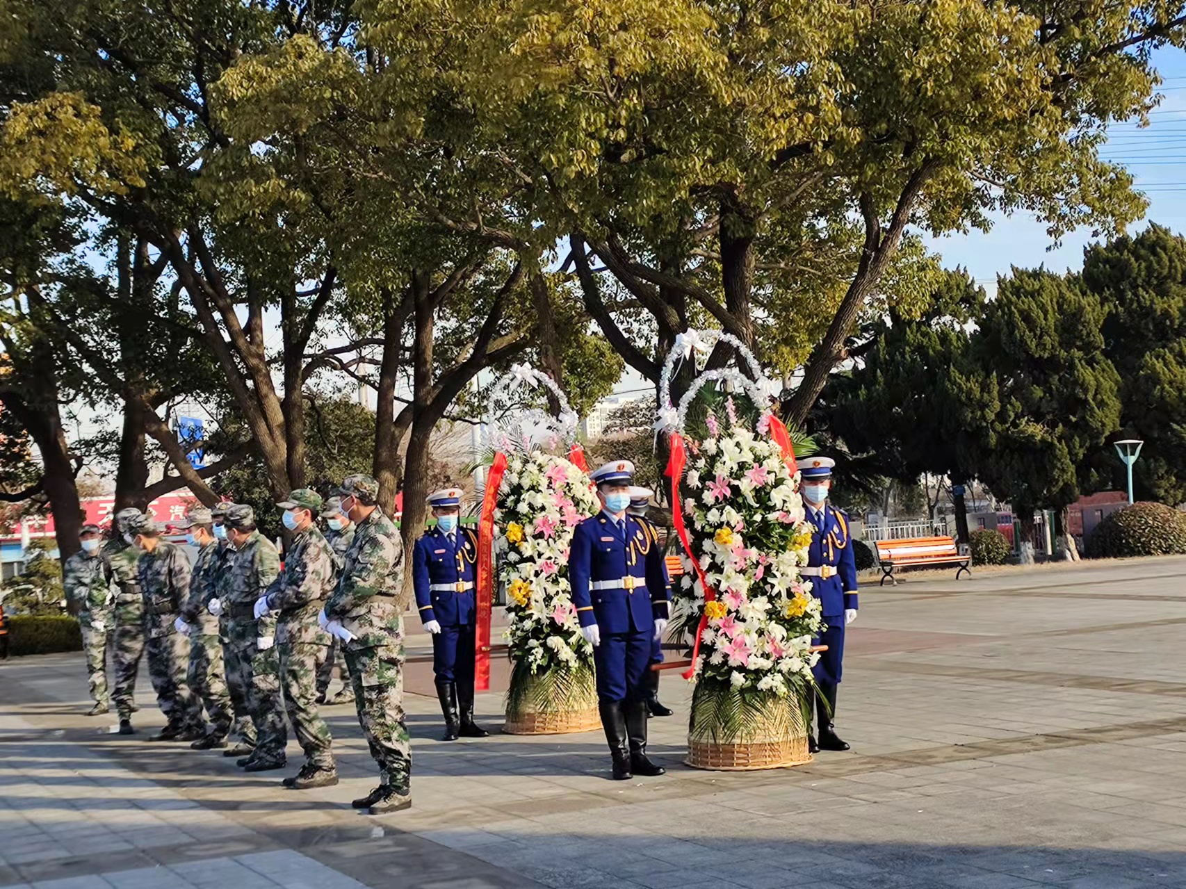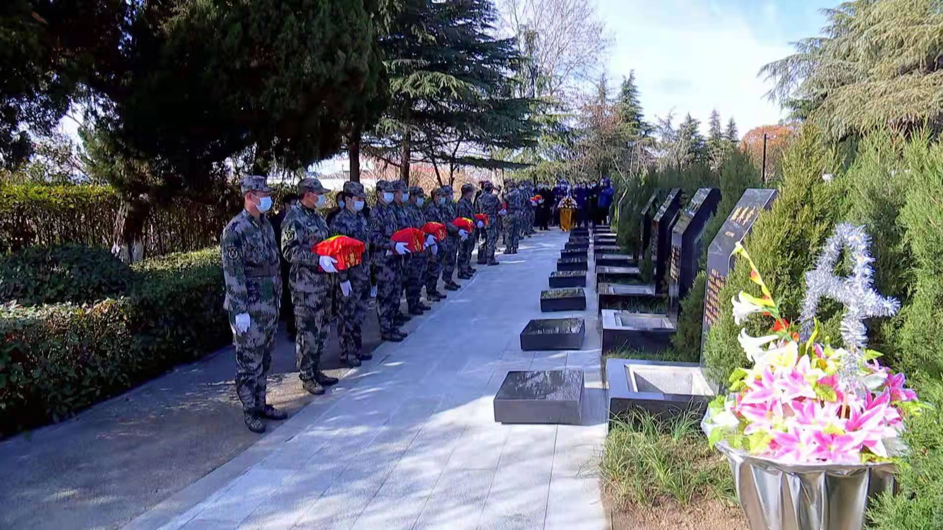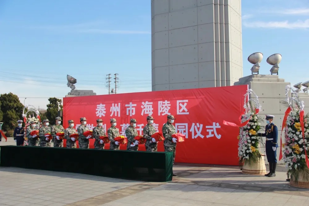 “青山埋忠骨,山河念英魂”迁葬仪式现场庄严肃穆。上午10时左右,迁葬入园仪式正式开始,由20名民兵完成交接,护送烈士骨函至革命烈士纪念碑前灵台上。全体人员肃立,奏唱《中华人民共和国国歌》。在《思念曲》中,全体人员向烈士墓致敬、默哀,8名列兵向烈士墓敬献花篮,表达对革命先烈的深切缅怀和崇高敬意。现场,泰州市退役军人事务局副局长吴杰出席仪式并致悼词。完成入土安葬后,全体人员依次向烈士敬献鲜花。