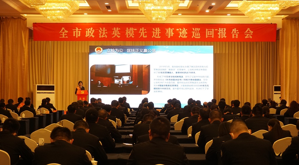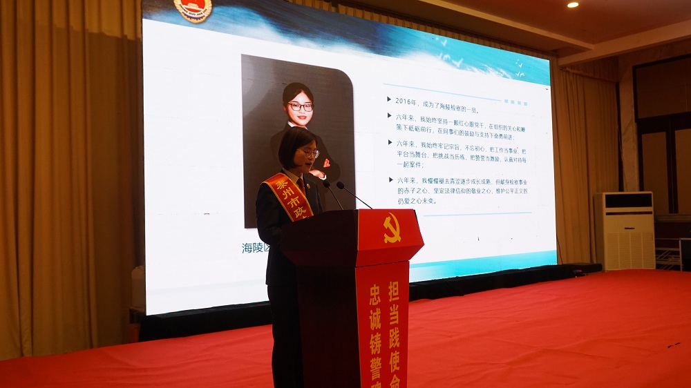4月20日下午,以“忠诚铸警魂 担当践使命”为主题的全市政法英模先进事迹巡回报告会在泰州市海陵区举行,泰州市海陵区委政法委、政法各单位领导班子全体成员和政法干警代表参加会议。泰州市海陵区人民检察院第二检察部副主任顾素梅作为政法英模,受邀参加英模事迹巡回报告会,并在报告会上作事迹报告。