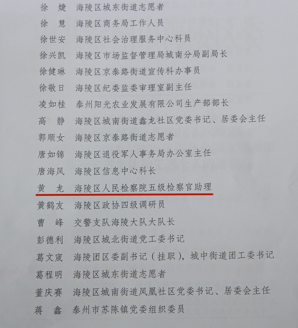 泰州市海陵区人民检察院荣获泰州市海陵区文明城市创建先进集体,我院干警黄龙、赵艳荣获文明城市创建先进个人!