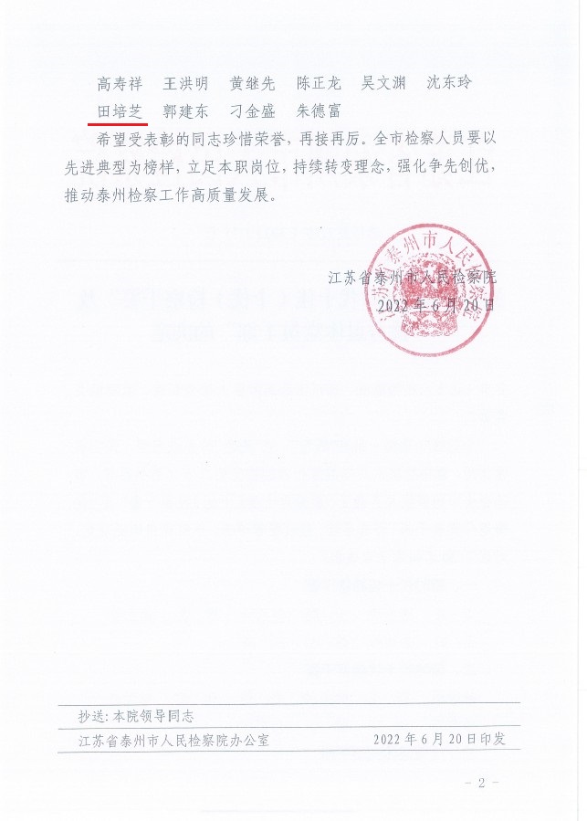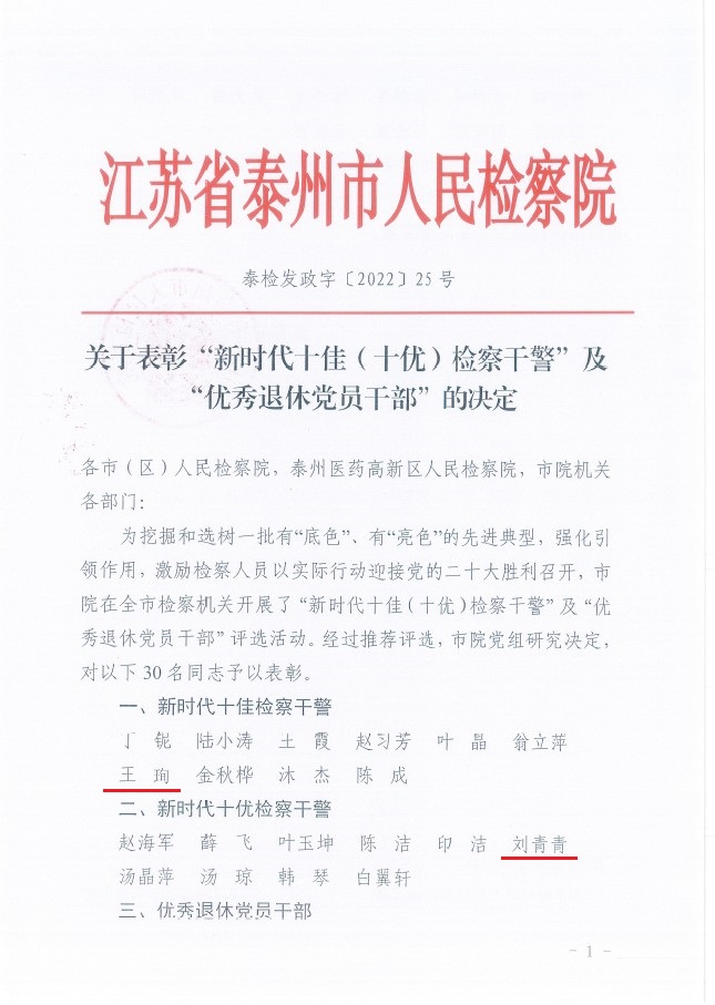 日前,在泰州市检察机关“新时代十佳(十优)检察干警”及“优秀退休党员干部”评选活动中,泰州市海陵区人民检察院王珣同志被表彰为“新时代十佳检察干警”,刘青青同志被表彰为“新时代十优检察干警”,退休同志田培芝被表彰为“优秀退休党员干部”。