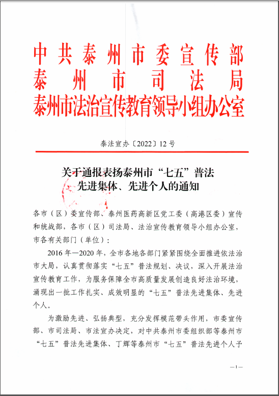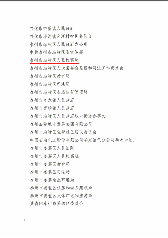 泰州市海陵区检察院被评为泰州市“七五”普法先进集体