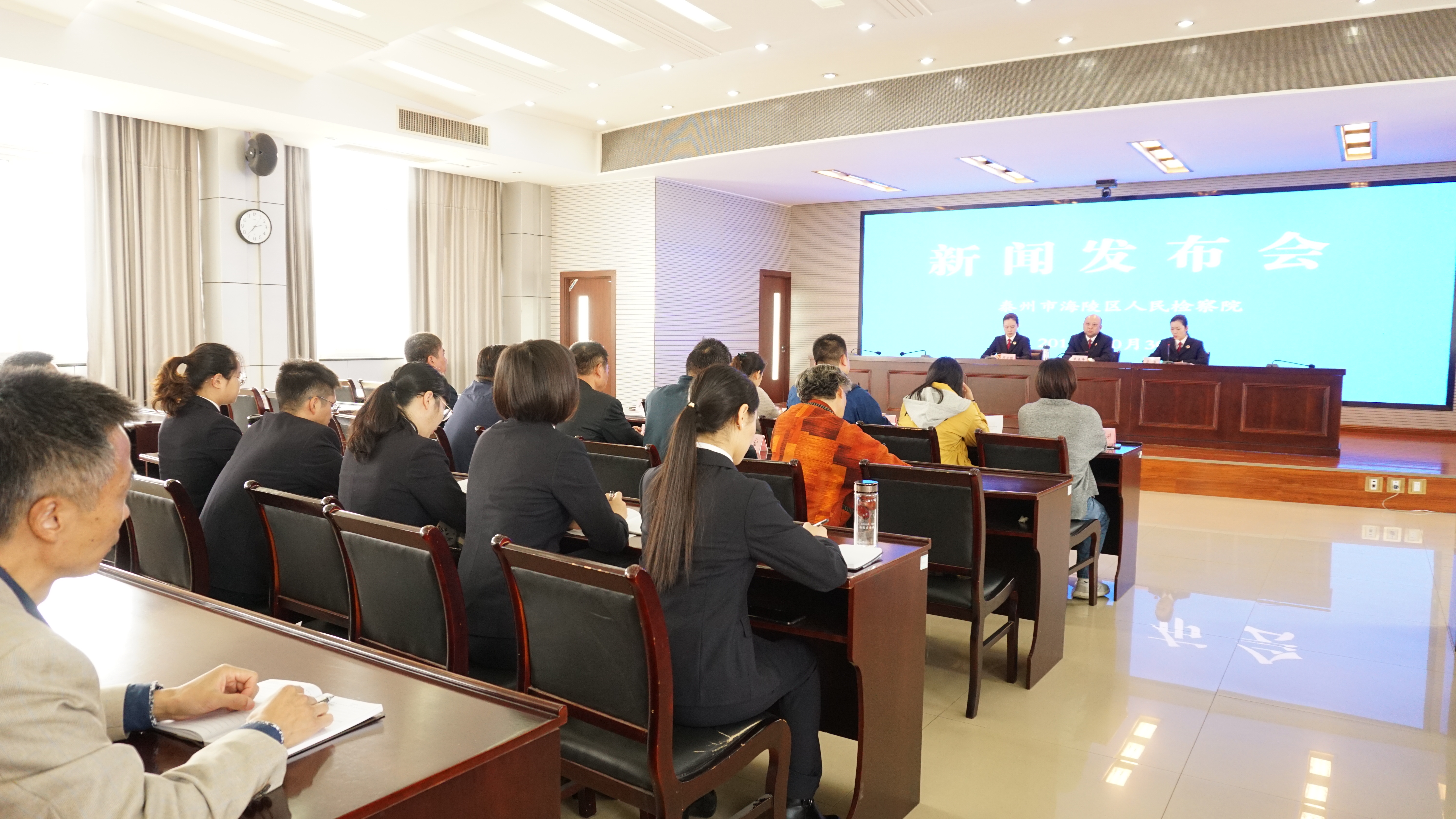 10月30日,我院召开司法救助工作专题新闻发布会,江苏法制报、泰州日报、网易泰州等多家线上线下媒体参会,副检察长朱亚峰主持,政治部主任、新闻发言人徐艳介绍相关工作,第五检察部控申工作负责人顾运维答记者问。