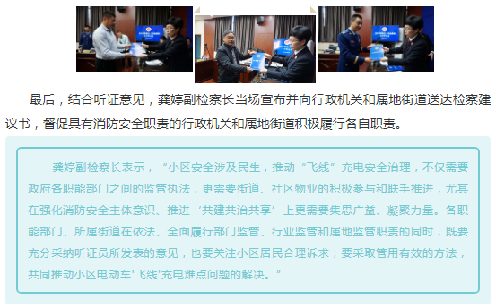 “飞线”充电属于公共消防安全领域,泰州市海陵区人民检察院为更好发挥检察机关公益诉讼职能,提升检察机关公益诉讼案件办理透明度和公信力,11月11日下午,泰州市海陵区人民检察院针对小区电动车飞线充电影响居民居住消防安全问题召开了听证会。