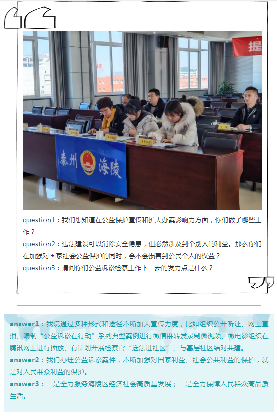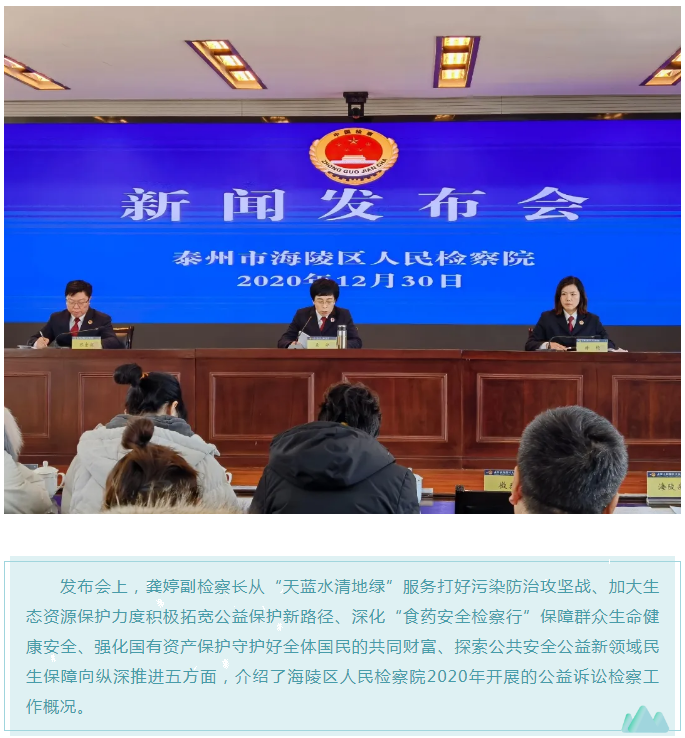 12月30日,海陵区检察院召开公益诉讼检察工作新闻发布会,泰州日报、泰州晚报、网易泰州等多家线上线下媒体参会,海陵区院党组成员、副检察长龚婷介绍相关工作,党组成员、政治部主任、新闻发言人徐艳主持,第五检察部副主任(正职)陈宏俊答记者问。